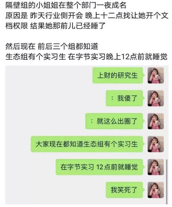 很快,她的事迹连带着整个部门,在相关部门都传遍了:“现在大家都知道,某某组有个实习生,12点前就睡觉。”