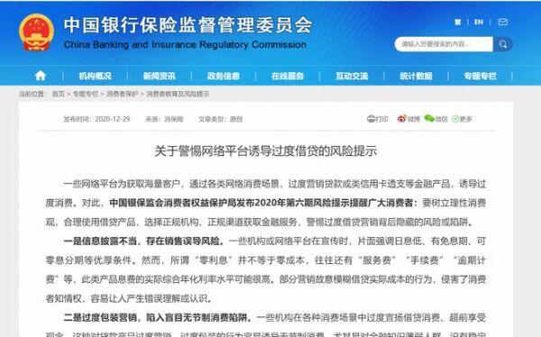 2020年12月29日,中国银行保险监督管理委员会发布《关于警惕网络平台诱导过度借贷的风险提示》。