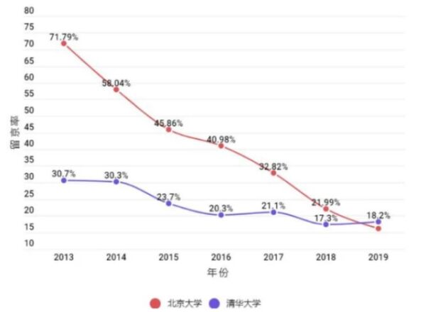 拿北京举例,从数据可以看出,北京大学的本科毕业生留京率从13年—19年都是维持着持续下跌的走向。而清华大学即使在19年本科留京率有所提升,也未能超过总数的20%。